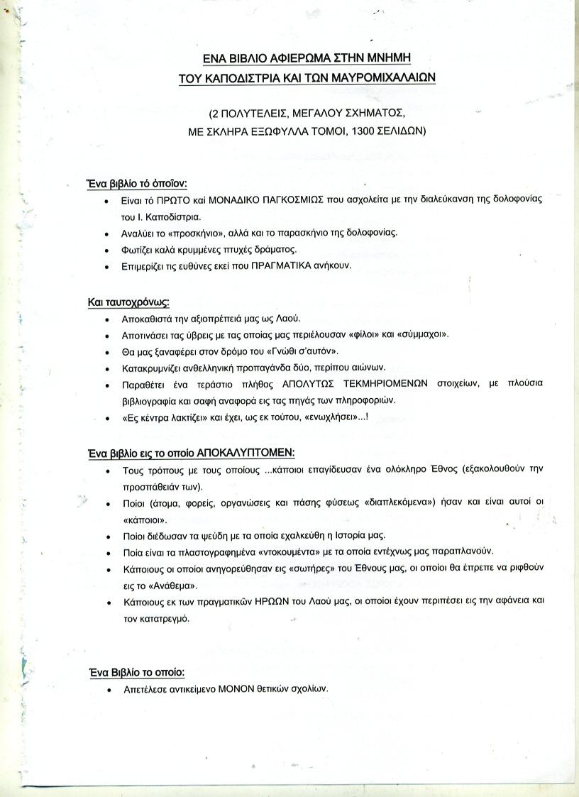 Τό πρῶτο καί ΜΟΝΑΔΙΚΟ ΠΑΓΚΟΣΜΙΩΣ Βιβλίο πού ασχολεῖται μέ την δολοφονία τοῦ Κυβερνήτου(δίτομο 1300 σελίδων Α4) Δίδει στοιχεῖα κρυμμένα καίἘπίσημα Ἀγγλικά Ἒγγραφα, ὃπου οἱ Ἂγγλοι ΔΗΛΩΝΟΥΝ πώς τό θέμα ἀποτελεῖ...Ἀγγλική Ἱστορία. Ὁ Φάκελλος παραμένει κλειστός 180 χρόνια Μετά 40 ὁλοκλήρων χρόνων ἒρευνες, ΑΝΕΚΑΛΥΨΑ καί κλεμμένα από τά Γενικά Ἀρχεια τοῦ Κράτους στοιχεῖα καί ΑΠΟΔΕΙΚΝΥΩ τίς ψευδολογίες πού σερβίρουν. Περιμένω ἀπορίες, ἐνστάσεις ἢ καί ἀντιρρήσεις, ὣστε νά ἀπαντήσω